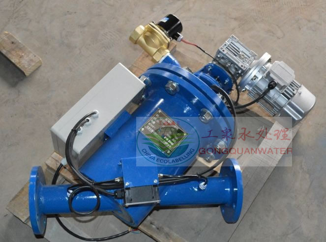 全自動自清洗過濾器是一種全自動在線自清洗水過濾器,過濾器網內安裝一套不銹鋼刷,或吮吸掃描器,或絲刷+吮吸組合,以上裝置由減速電機帶動旋轉,在過濾器端蓋上或底部安裝一個電動排污閥。工作時,濁水由進水口進入,通過不銹鋼楔形網過濾污物。凈水由出水口流出,當污物聚集過多時,造成過濾不暢,腔體壓力上升,當進出水的壓力差值達到一定值時(預先設定),壓差開關發出信號給控制器,控制器啟動減速機電機,帶動內部裝置旋轉刷掉或吮吸污物雜質。同時打開電動排污閥,排出污物,清洗時間約為1分鐘,自清洗期間無需斷流,排污壓力損失不超過0.05MPa,流量損失不超過1%。